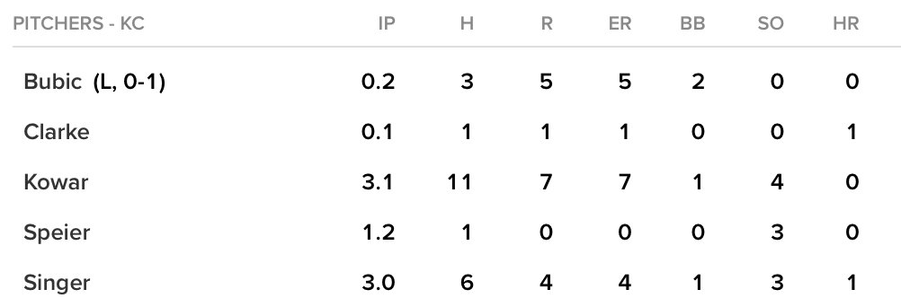 Again, and I can’t stress this enough, it’s important that we limit the overreactions to the first three games of the season. Still, this pitching box score from Sunday’s debacle really stood out.