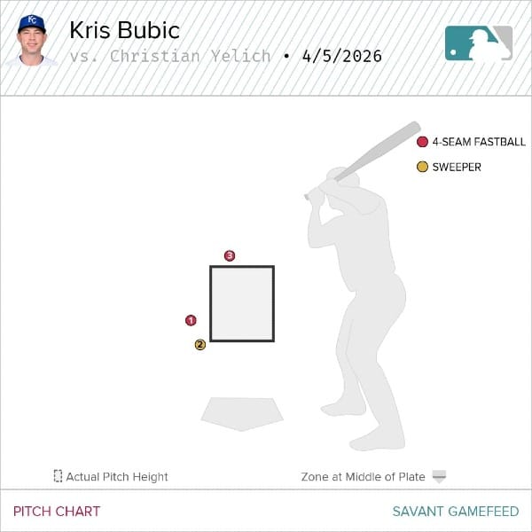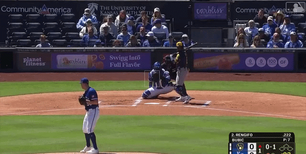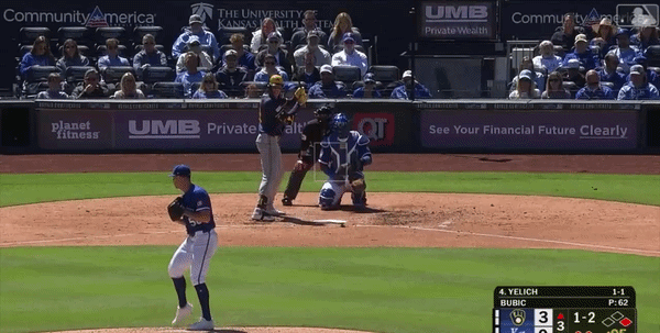 Yellich didn’t barrel the third fastball in the zone and was actually behind the pitch. He lofted it down the line and ultimately, just out of the reach of Nick Loftin, playing in left. A tough play for Loftin. Buzzard luck for Bubic. The Yellich batted ball had an expected batting average of just .100. Instead, it went for a run-scoring, two-out triple. The Royals were behind 1-0 just four batters into the game.