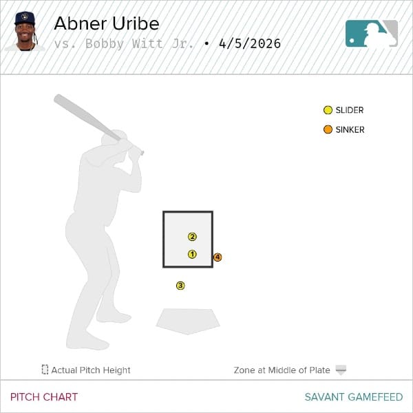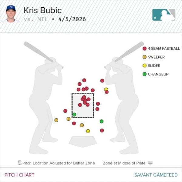 Last year, Sunday's starter Kris Bubic threw his four-seam roughly 36 percent of the time. Out of his arsenal of five different offerings, it was his most frequently utilized pitch. The first time through the order on Sunday against the Brewers, Bubic leaned on his four-seamer a whopping 68 percent of the time.