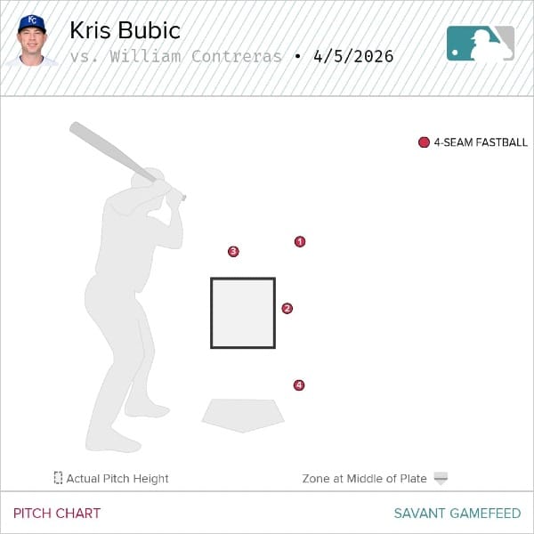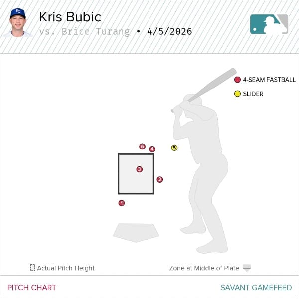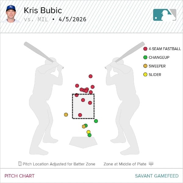 Bubic is at his most effective when working up in the zone with his four-seamer. The cluster in the middle of the zone is only slightly alarming because Bubic was pitching behind the count for most of that inning. Those are tasty fastballs for hitters. They were necessary for Bubic to find his footing.