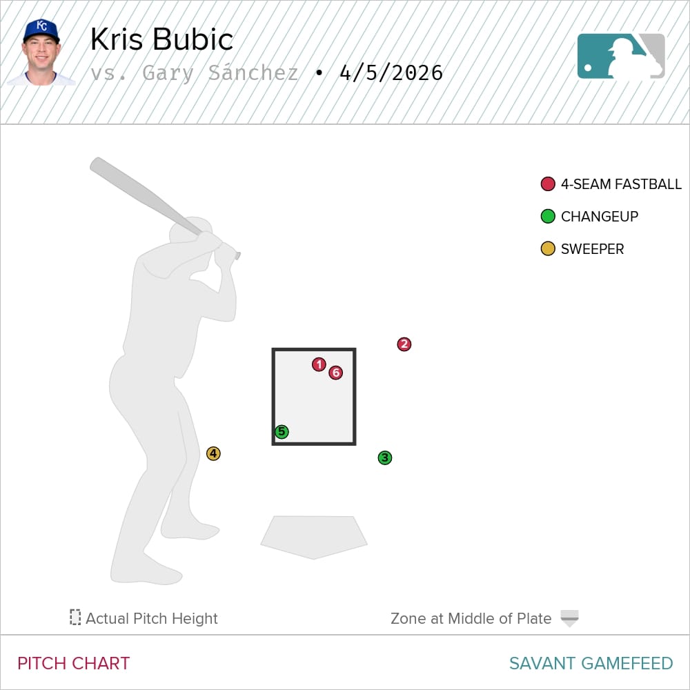 Sánchez didn’t move his bat on any of the first five offerings from Bubic. Can’t blame him as again Bubic was uncompetitive with his offerings once he jumped ahead with that first-pitch fastball. Bubic came back with a 3-1 change that was perfect in execution. It had both location and the element of surprise. It was a nifty pitch.