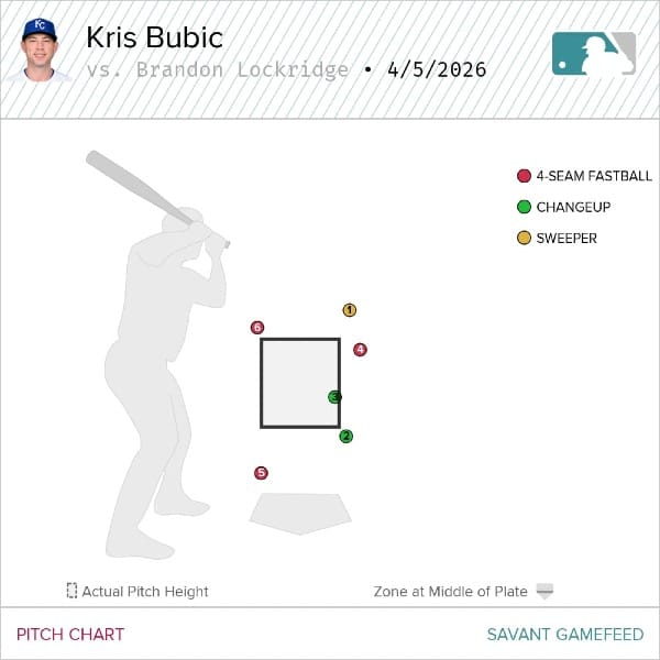 After uncorking a sweeper well up and away, Bubic went to back-to-back changeups to jump ahead. Pitch two, down and away, was offered at by Lockridge and missed. Pitch three, nestled on the outer edge of the plate, was fouled off. From 1-2 though, Bubic went to the four-seam well for the next three pitches. He missed badly with all three and Lockridge walked.