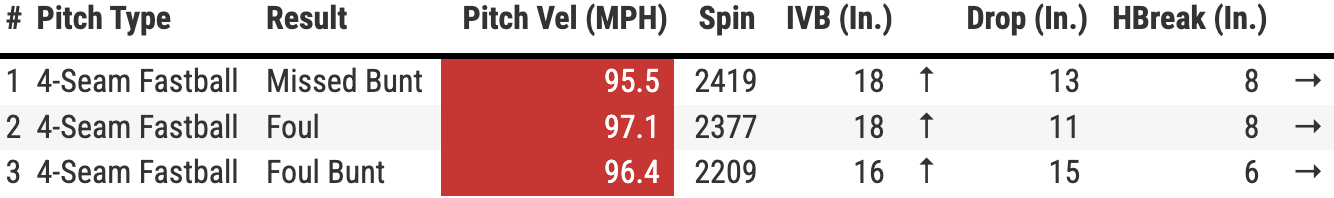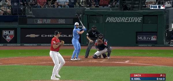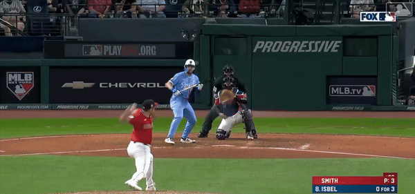 Isbel bit on the first fastball. Fine. He tried to pull back. Except it was never, ever going to be a strike. Smith’s four-seamer doesn’t rise. It was elevated from the moment it left his hand. Sure, he’s throwing gas at around 96 mph, but Isbel is an accomplished bunter. He needs to keep the bat back on that pitch.
