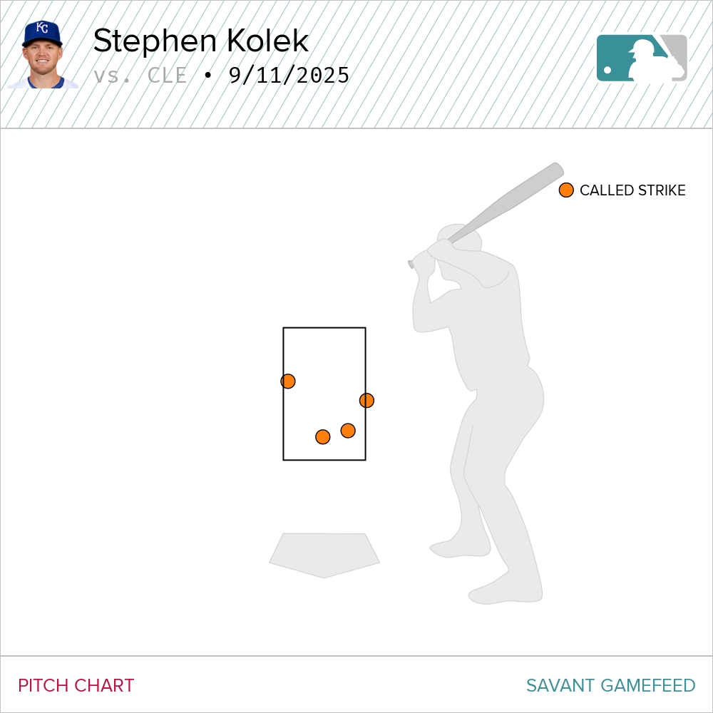 The right-hander was mixing his four-seamer with his change while showing a sweeper and slider for a little variety. Honestly, I’m not sure how Kolek did it. He did not miss many bats—he had only four swinging strikes on the night, all on his changeup. Nor did he get the Guardians to chase. They went after pitches outside of the zone just 14 percent of the time. Kolek also gave up plenty of hard contact, allowing Hard-Hit balls on nine of the 19 that Cleveland put into play. Hell, Kolek even fell behind most of the hitters he faced. He struck out four, all of them looking at four-seamers.