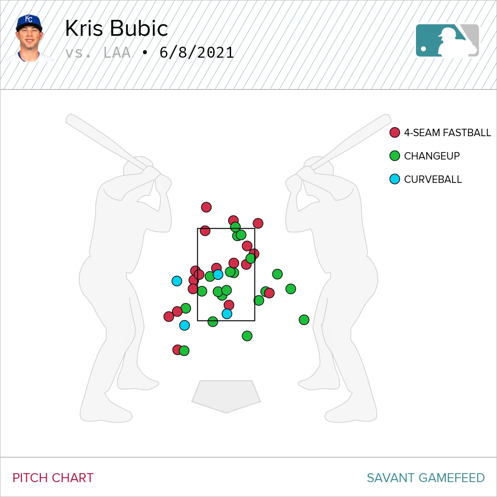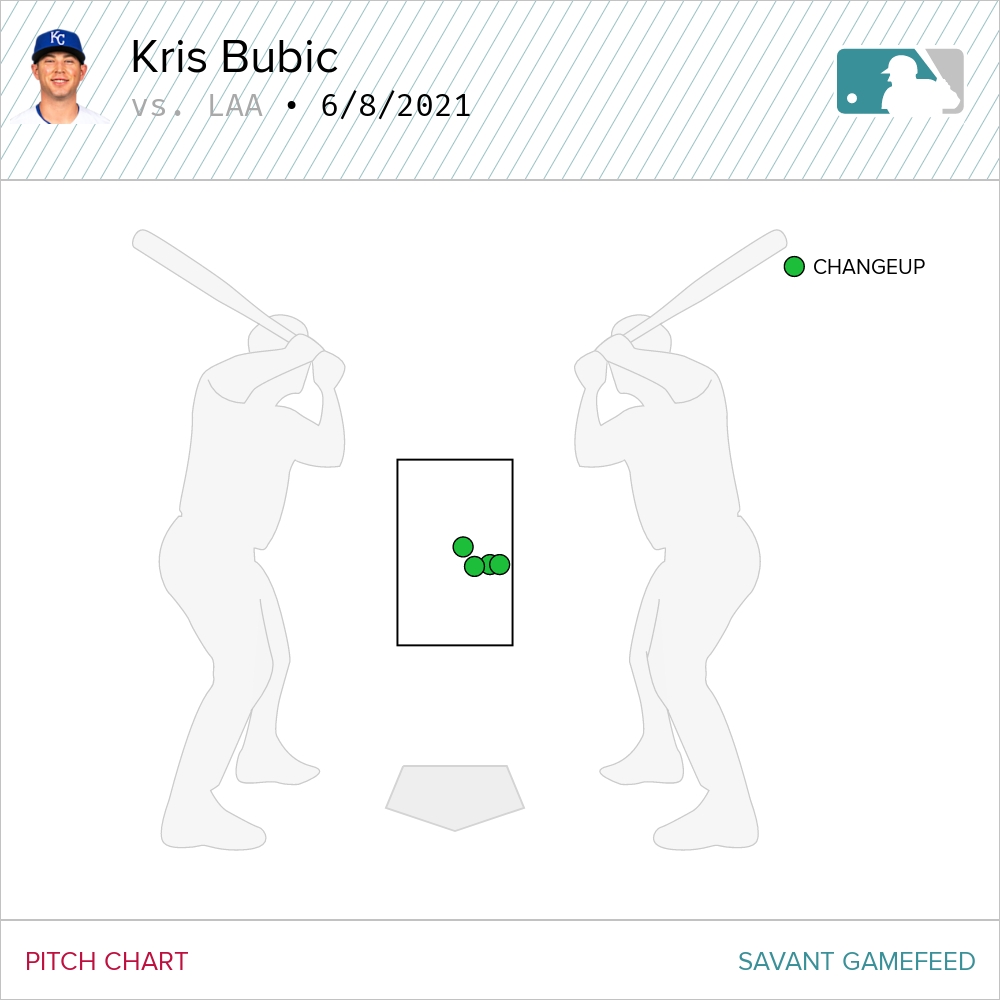 It was a minor miracle that Bubic was able to rally and give the Royals four innings. So credit for saving the bullpen. But Bubic was leaving his change in a tasty part of the plate and Angels hitters were feasting. Other than that Ohtani undressing in the first inning, Bubic allowed three more dingers, all off the change. All four together were of the no-doubt variety. And look where all four pitches were located.