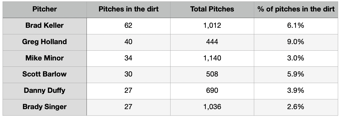 Of course, it’s not a wild pitch (or passed ball) unless runners are on base. Fortunately, Baseball Savant is here to help record all pitches thrown in the dirt. The Royals lead the league here by quite a wide margin, both in total and by percentage.