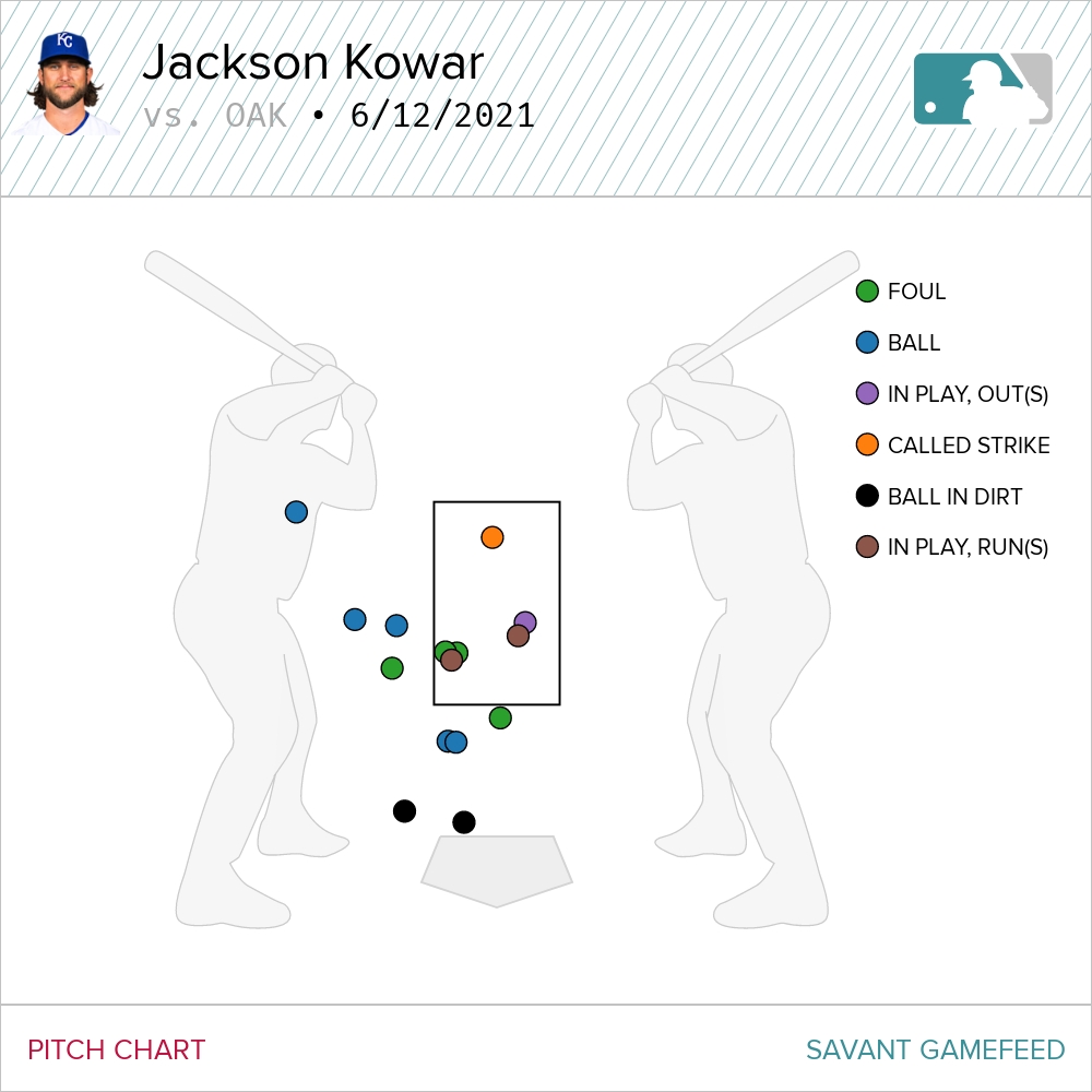 When going back through and rewatching his outing, I was struck by how little Kowar challenged left-handed batters inside on Saturday. He delivered two pitches on the inner third (or a little more inside) to lefties.