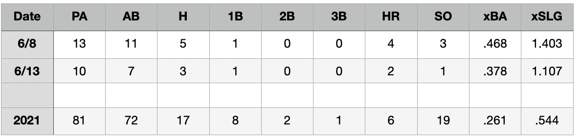 The home run he allowed to Brown was on the sinker, the first time he’s allowed one to leave the yard in 2021. In his major league career, this is the worst stretch that Singer has had with that pitch. The velocity is fine, the spin rate is consistent…I have no insight as to why his sinker is getting hit harder now. At this point, it’s only an observation.