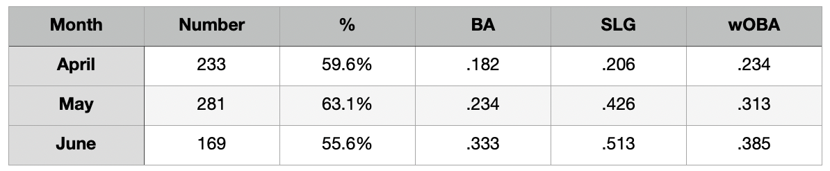 We saw a lot of that on Friday. On the flip side, after working well in the first month-plus of the season, Singer’s sinker has slowly been losing its effectiveness. In the table below, “number” refers to the total number of times he’s thrown a sinker while “%” is the percentage of his total pitches. The rest of the numbers are the results.