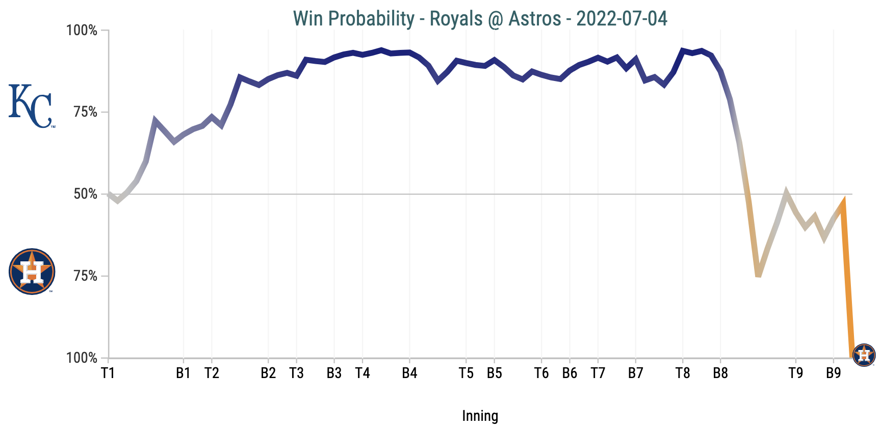 Hell, I don’t know. Maybe both are valid metaphors. The Royals hung with the Astros for a few innings but couldn’t hold on to that early lead as Houston walked off to their Fourth of July barbeque 7-6 winners.