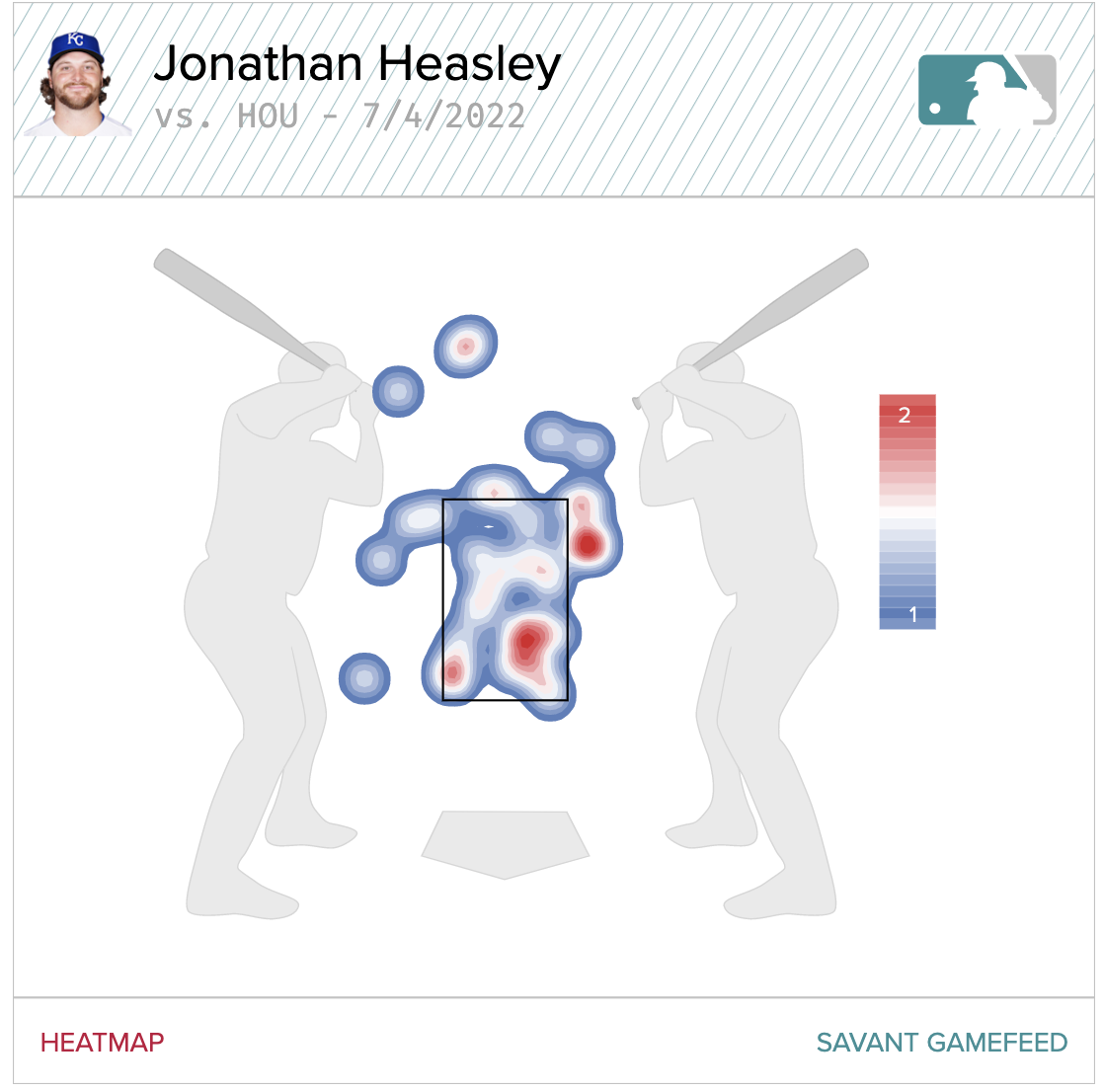 I know there’s been talk among analysts that Heasley’s fastball has a bit of rise to it that can bring the swing and miss, but he’s consistently locating the pitch in the middle of the zone. Not ideal if you’re looking for a whiff. This was Heasley’s heat zone for the four-seamer prior to Monday’s outing against the Astros.