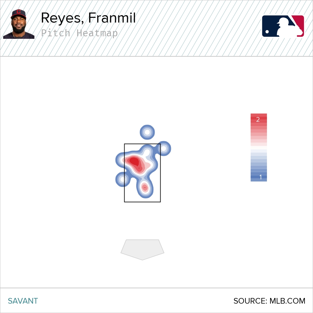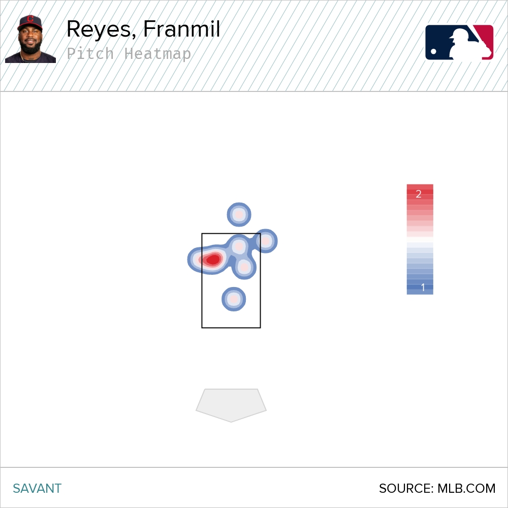 As Royals Farm Report noted on Twitter, the home run happy zone for Franmil Reyes is up and in. Reyes had hit 13 dingers prior to Thursday. His heat map does indeed show a preference for elevated pitch on the inner half.