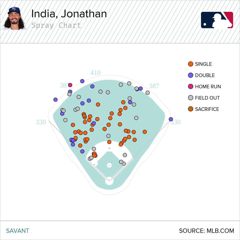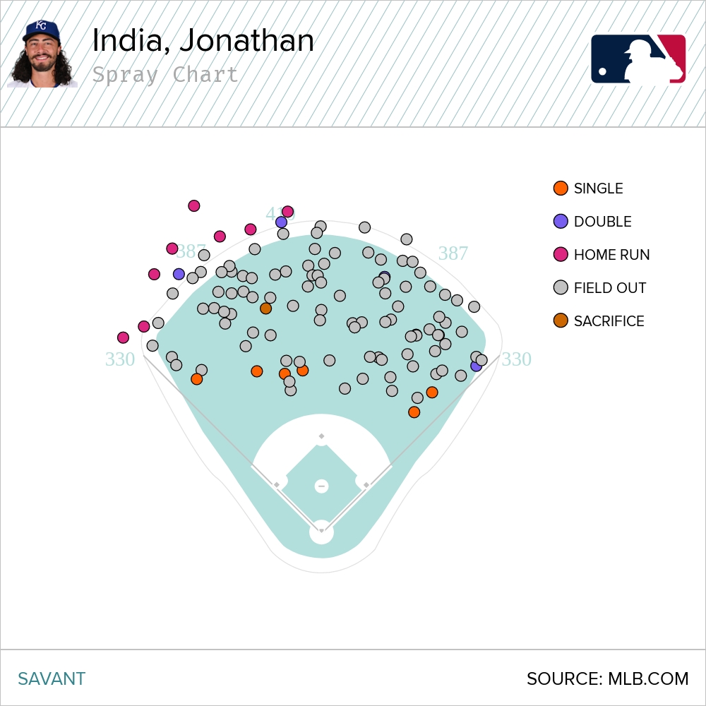 When India hit a ball classified as a fly ball from Baseball Savant, it left his bat with an average exit velocity of 90.5 mph with an average launch angle of 37 degrees. If that sounds suboptimal to you, that’s because it is. Here's what it looks like in a spray chart.