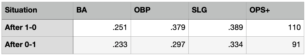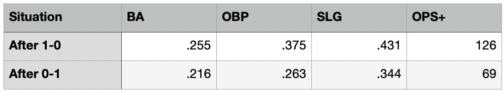 India gets a lot of hate among the fanbase, but are you surprised that he’s an above average hitter when he moves ahead in the count after the first pitch? Likewise, he doesn’t do as bad as the league on average when he falls behind. The problem, as I stated above, is he looked at far too many first-pitch strikes last season.