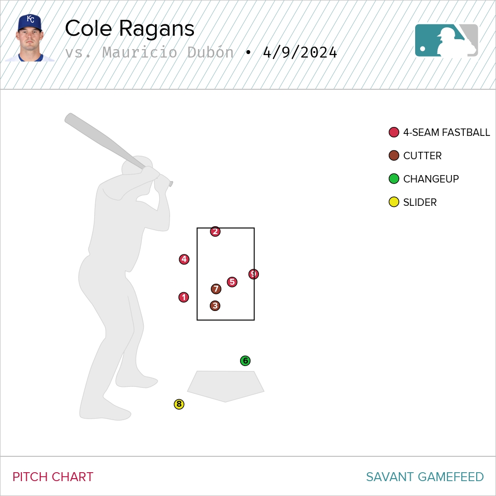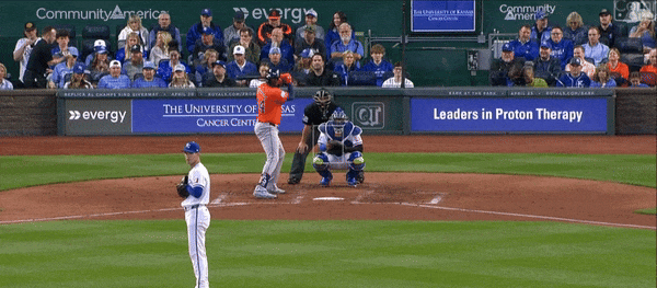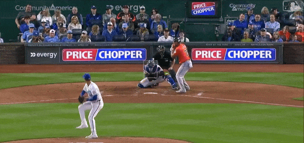 Early on, starter Cole Ragans felt a bit nibbly to me. As if he wasn’t properly attacking the Astro hitters. The stuff was there, but Ragans just lacked a certain…dominance. Just kind of a weird start. The best example of this came against Mauricio Dubón in the second who worked Ragans for a nine pitch at bat before flying out. The first pitch in the confrontation was a ball and then Ragans came back with mostly four-seamers. The fourth pitch was a good one that got a swing, but Dubón fouled it off. After that, though, Ragans was either way out of the zone with his secondary pitches or caught too much of the dish with the four-seamer.
