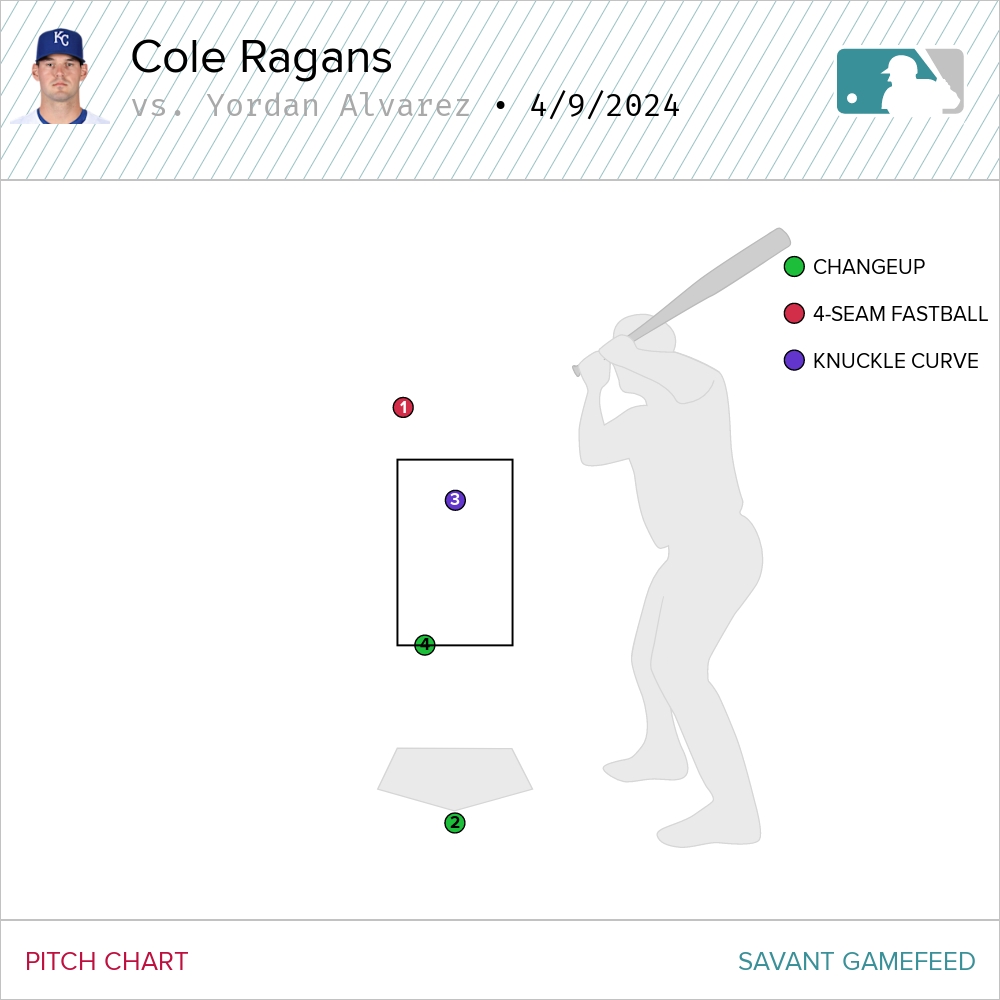 The sequence is good. Ragans missed up with a four-seamer and down on the change. Down in the count 0-2, he spun a knuckle curve over the heart of the plate. Not a great location to be sure, but Alvarez was certainly looking for something with a little more smoke and couldn’t pull the trigger. The fourth and final pitch was a changeup that barely caught the bottom of the zone. It’s a good pitch given the situation and the sequencing. Alvarez just went down and got it.