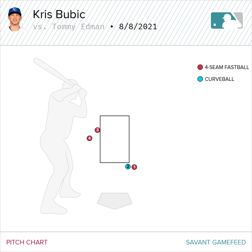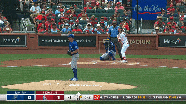 You never want to issue a four-pitch free pass to open an inning. Especially after your club just handed you the lead. Edman struck out on three pitches in his previous at bat, with the third pitch a fastball up and out of the zone. This time, Bubic didn’t get calls on close pitches (Ángel Hernández was behind home plate, so who knows where the strike zone was located from inning to inning) and, working behind in the count, could not get Edman to offer.