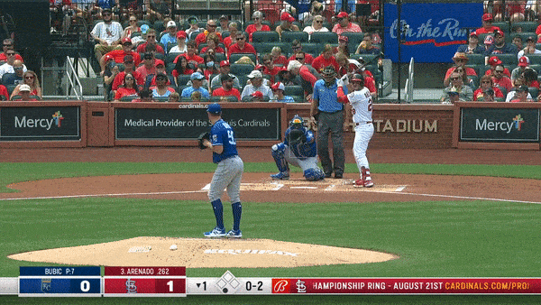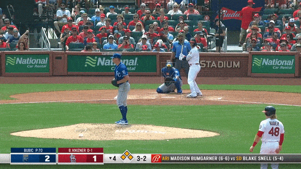 Bubic was way off the plate. At this point, Bubic was rubbing the palm of his hand against his outer thigh in what looked like an attempt to dry his pitching hand. He was also going to the rosin bag quite a bit. It was a humid, sticky day in St. Louis, so that was probably a factor in how Bubic was able to spin the ball.