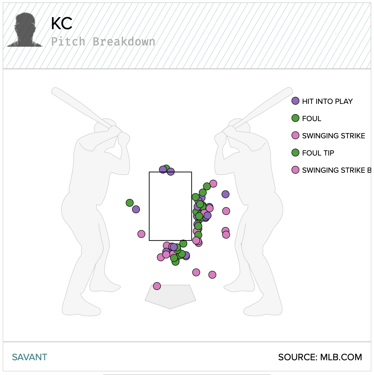 While looking up chase rates for the Royals’ offense, I also checked out how each Kansas City pitcher did over the series in inducing the opposing hitters to go out of the zone for their pitch. I didn’t include this in Bubic’s section above, but he was able to get 11 swings on pitches outside of the strike zone on Sunday, including this whiff of Bader: