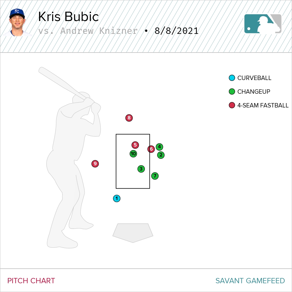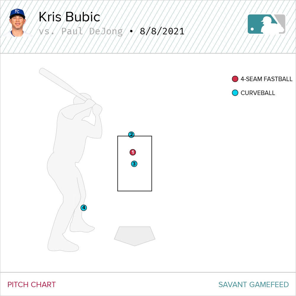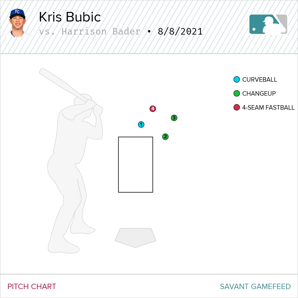 Bubic was playing with fire all afternoon, allowing the leadoff hitter to reach in each of his five innings of work. (Aside from the Carlson home run, the Lester double and walk to Edman, Bubic walked Bader to open the second and surrendered a single to Carlson in the fifth.) Somehow, he was able to tap dance around any damage. Two double plays and a pitcher running the bases certainly helped. Overall, Bubic had just a 23 percent CSW but he was generally able to avoid hard contact.