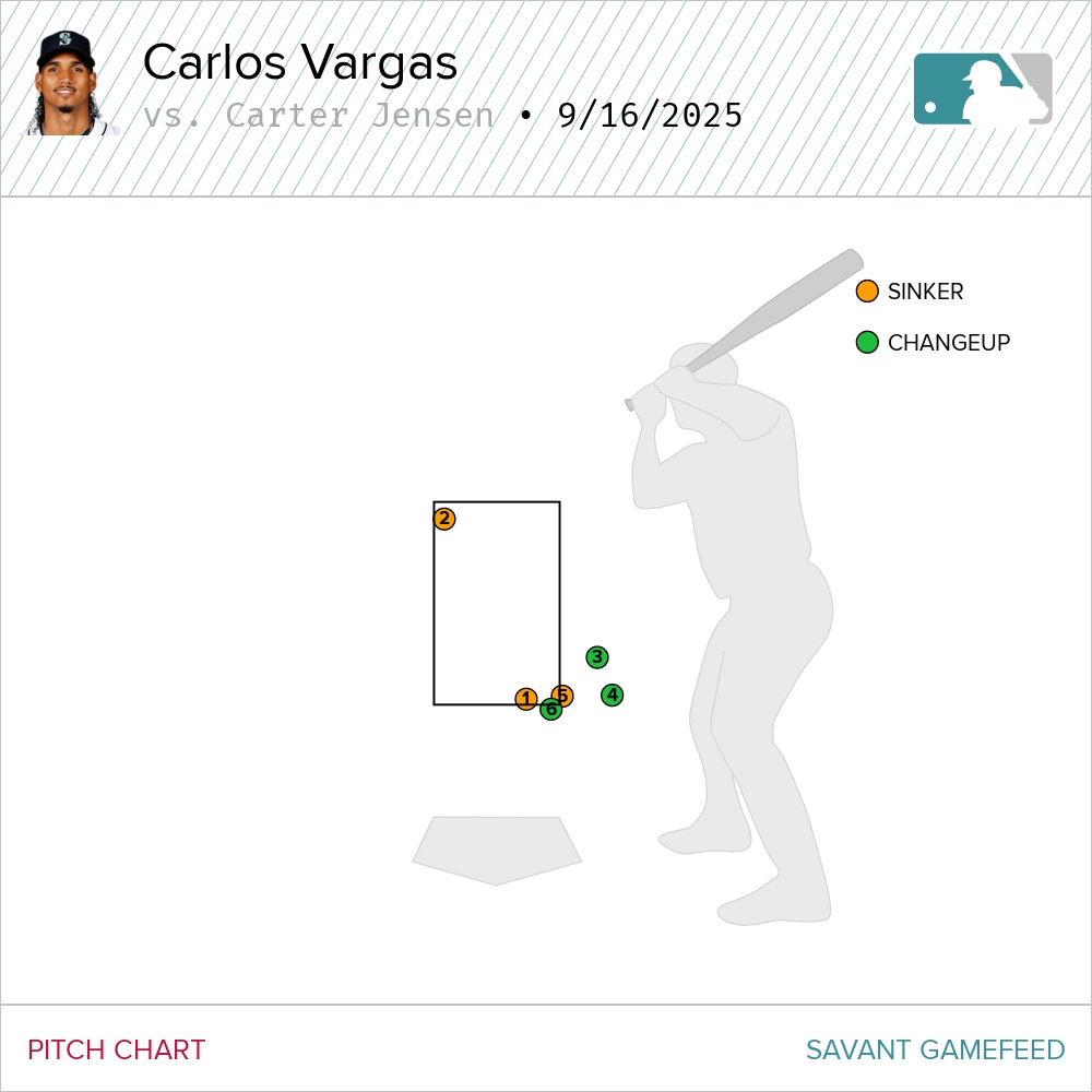 That was the culmination of a six-pitch battle against Seattle reliever Carlos Vargas. Five of Vargas’s pitches were located in that general area down and in. So Jensen was probably hunting for that pitch with two strikes. Also, Vargas had alternated sinkers at 96-97 with that change at 92-93. Not a lot of separation. I’m making it sound easy for Jensen. It was not. It was impressive awareness from a kid with fewer than 20 big league plate appearances.