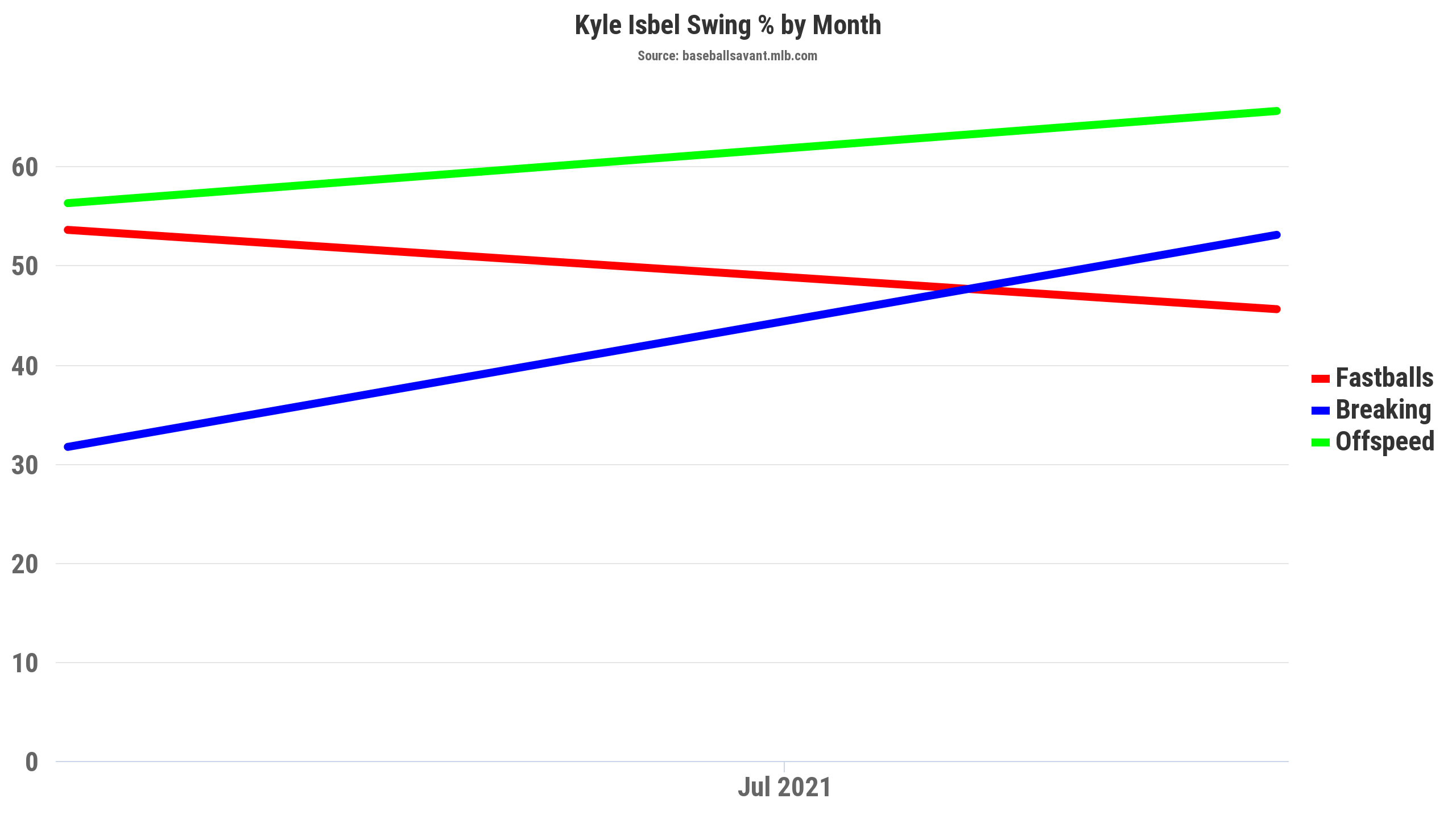 Yes, Isbel reduced his swing rate on the fastball but was much more aggressive on offspeed and breaking pitches. As detailed at FanGraphs, the result was an overall swing rate on pitches in the zone went from 55.4 percent in April to 63 percent in September. Meanwhile, his swing rate on pitches outside the strike zone tumbled from 40 percent in April to 34.7 percent in September. Part of that is probably just comfort in coming through for a second cup of coffee following a successful stint in Triple-A. However, Isbel did recognize the need to make adjustments.