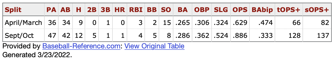 The big difference is how his April success, as limited as that was, was powered by BABIP. That regressed in September, but his on base percentage and batting average saw increases. How about a 200 point jump in slugging? Eliminate that hip slide, inject a dose of confidence in a new approach at the plate and amazing things can happen.