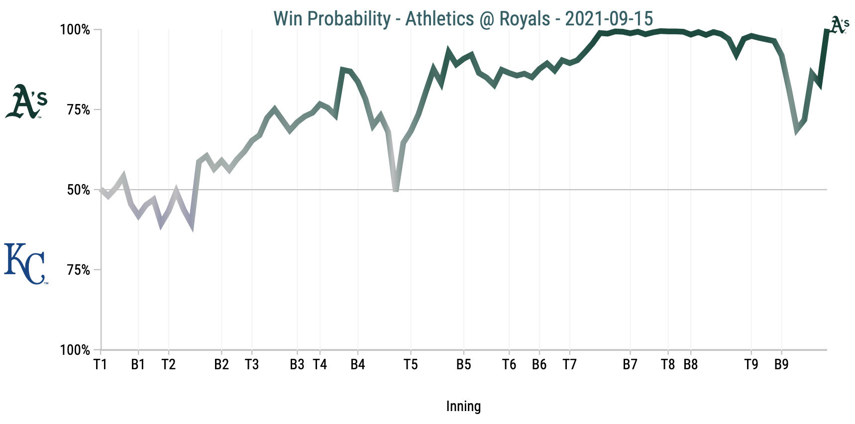 The A’s had a 99 percent chance of winning the game entering the eighth inning. I understand that doesn’t mean the game was over, but if there’s ever a chance to get some guys off the field, it was at that moment. Of course, we’re talking about Merrifield who is currently riding a 451 consecutive-game streak and Perez who has missed only one game all year. The argument can be made that there has been plenty of opportunities to give either player a rest at random times this year, especially in the season’s second half when they’ve been well out of any kind of contention. But the Royals don’t operate that way.