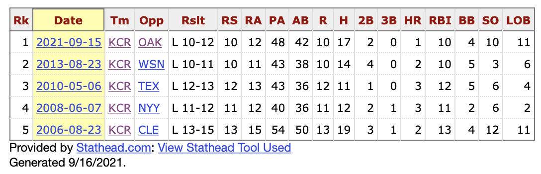 It’s the first time the Royals have scored 1- runs in a game and lost since dropping a 11-10 defeat to the Washington Nationals in August of 2013. In the Dayton Moore Era, counting that game against the Nats, it happened four times where the Royals scored 10 or more and lost. Welcome to your new job, JJ Picollo.