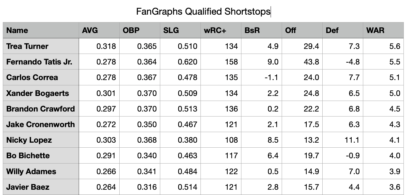 Just for grins, here are the top 10 shortstops in the majors by fWAR.
