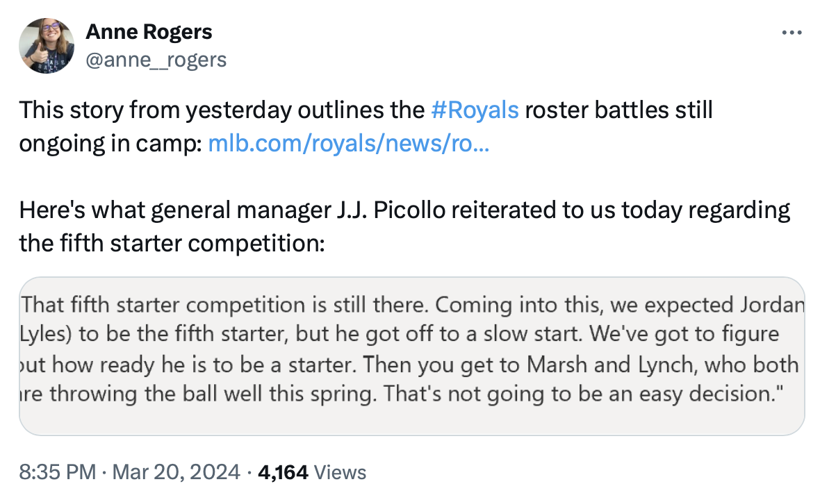 I touched on this in my last edition about the Royals going with Cole Ragans as their Opening Day starter; the team is a bit more process-oriented these days with Picollo at the helm. And that’s a very good thing.