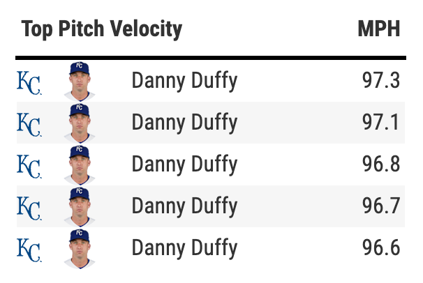 Sure, Duffy could have the top pitch velocity in the early innings of a game, but that’s usually depending on his starting counterpart. That’s not the point. The point is more of a question or just flat disbelief: Duffy was throwing that fast?
