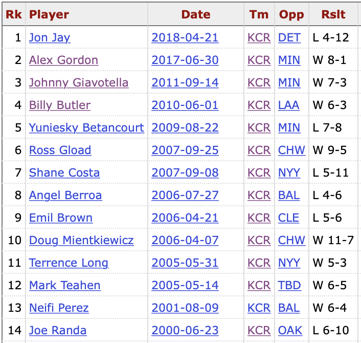 The Royals offense, scuffling for the last week-plus, did just enough to secure the win. The first two runs came courtesy of Carlos Santana—a sacrifice fly in the first and a ground out in the third. Santana is the third Royal since 2012 to tally two RBI without the benefit of a hit or a walk. The list of Royals who have done this since the turn of the century is quite a rogues gallery.