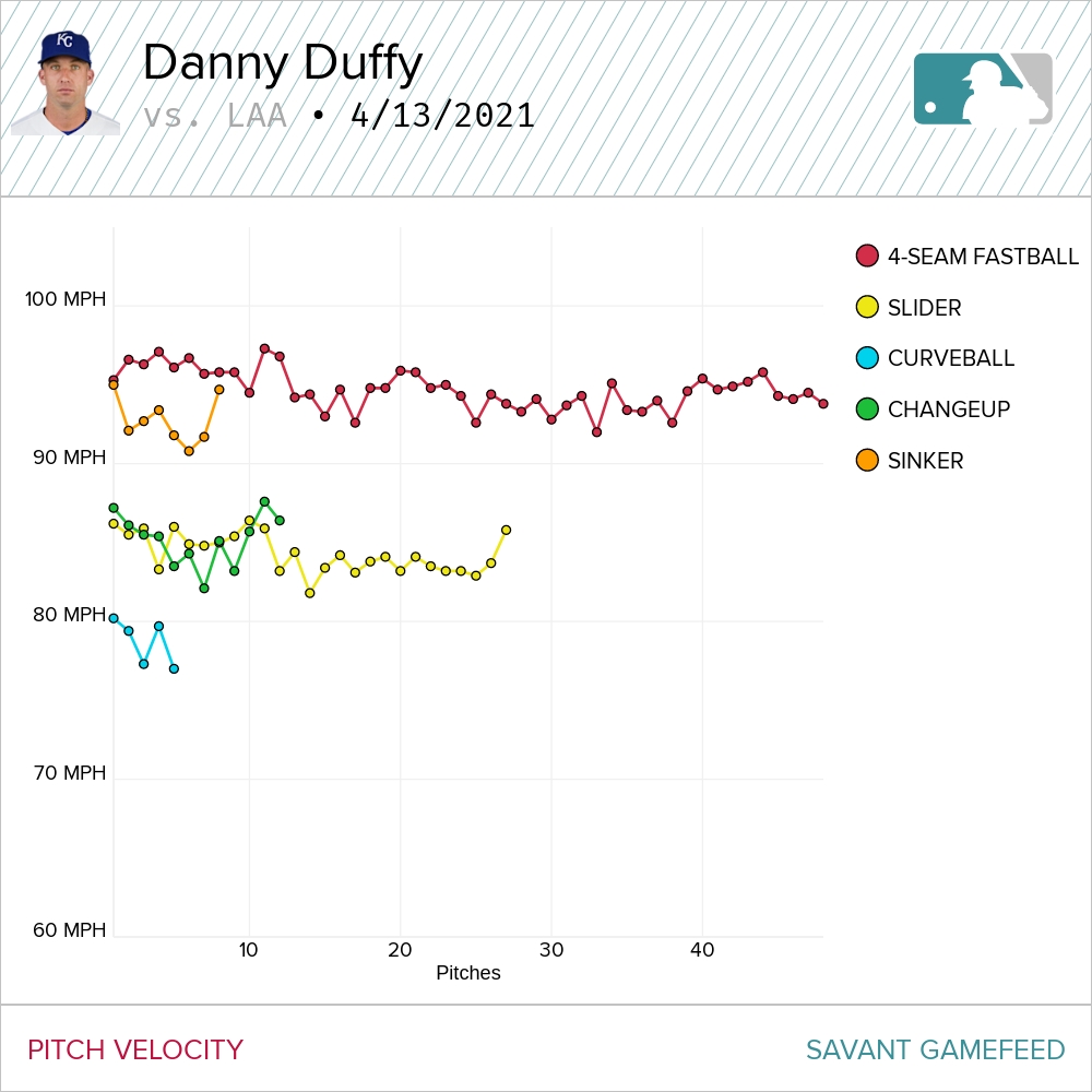 Even as a starter, Duffy has always been a max effort kind of guy in that he goes out and always drains the tank in his starts. It doesn’t necessarily manifest itself in the fastball velocity but his normal pitch velocity chart has a bit of fade the longer he’s in the game. He had that on Tuesday but it was the normal decline we see from the early innings to the later ones. Not a sharp one I was expecting when he came out in the top of the first throwing heat.