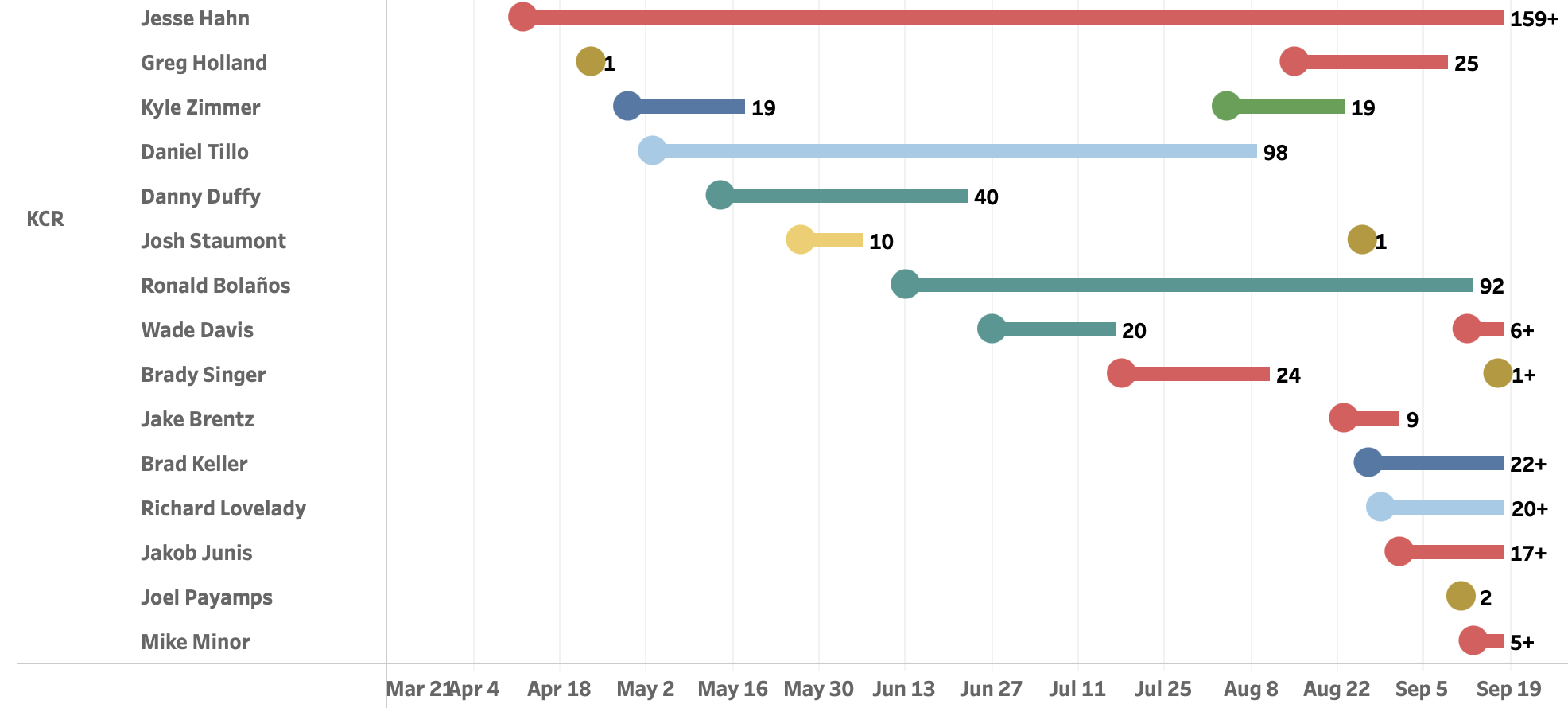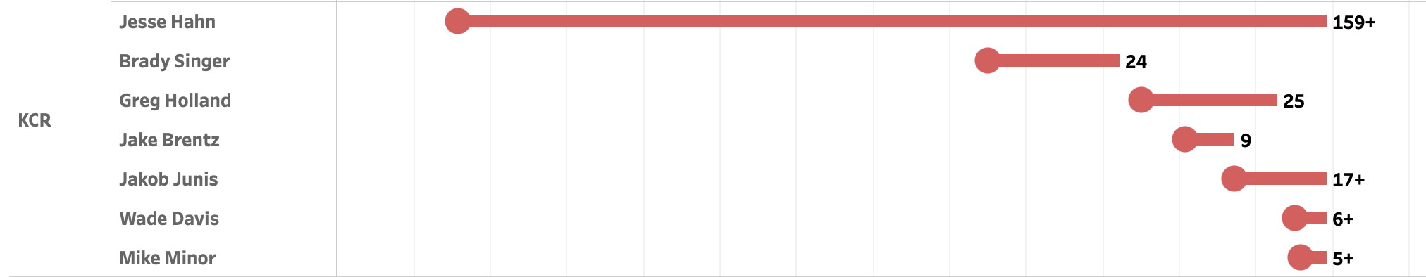 Obviously, that has accelerated over the last month of the season. It’s difficult to spot any kind of trend, other than there have been a lot of shoulder injuries in the last 30 or so days, mostly of the impingement syndrome variety. It’s a mix of pitchers…veterans and young, starters and relievers. Although looking at the list, only Brady Singer and Jake Brentz are two you would pinpoint as having any kind of future with the club where you would count on some kind of results. It does skew a bit more to the veteran reliever side with Jesse Hahn, Greg Holland and Wade Davis on the shoulder injury list.