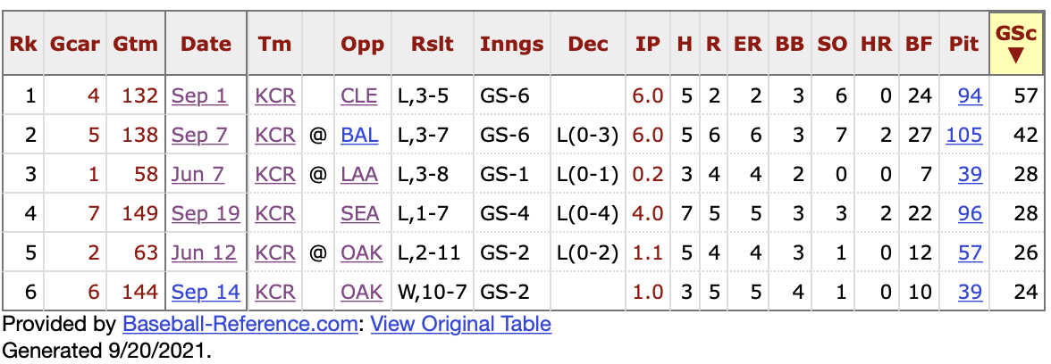 Since his return to the rotation at the start of the month, Kowar has been only moderately better. And my assessment is probably on the side of being too kind. Here are his six major league starts, ranked according to Game Score.