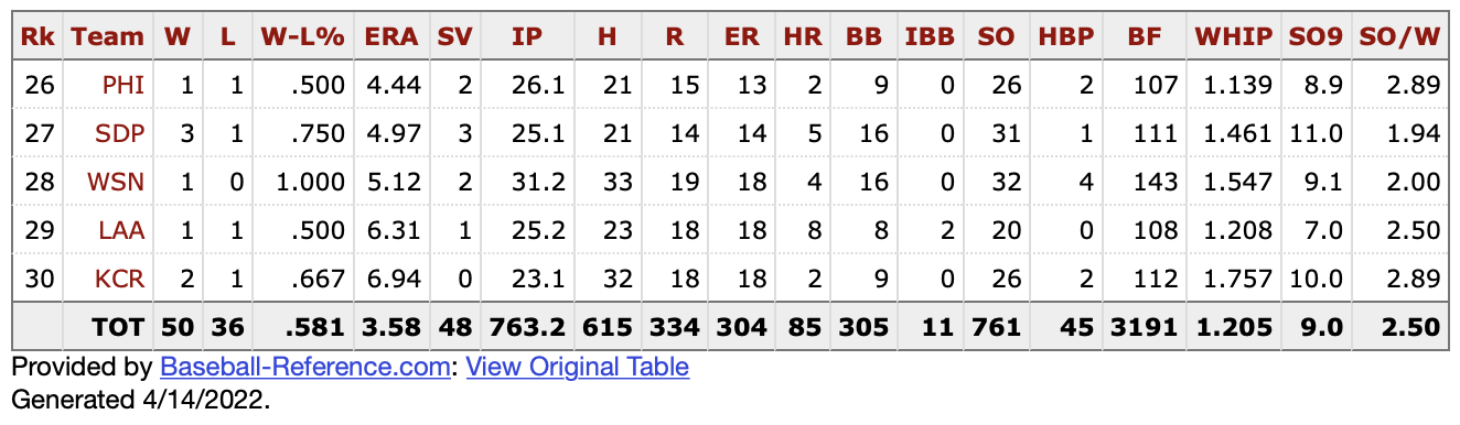 Through five games, Royals pitchers own a 6.80 ERA. It’s the worst mark in the majors. That’s a full run (and more) than the next-worst team. And that’s after they allowed just one run through the first two games of the year. Hey, it happens when you cough up double-digit run totals twice in the season’s first week.