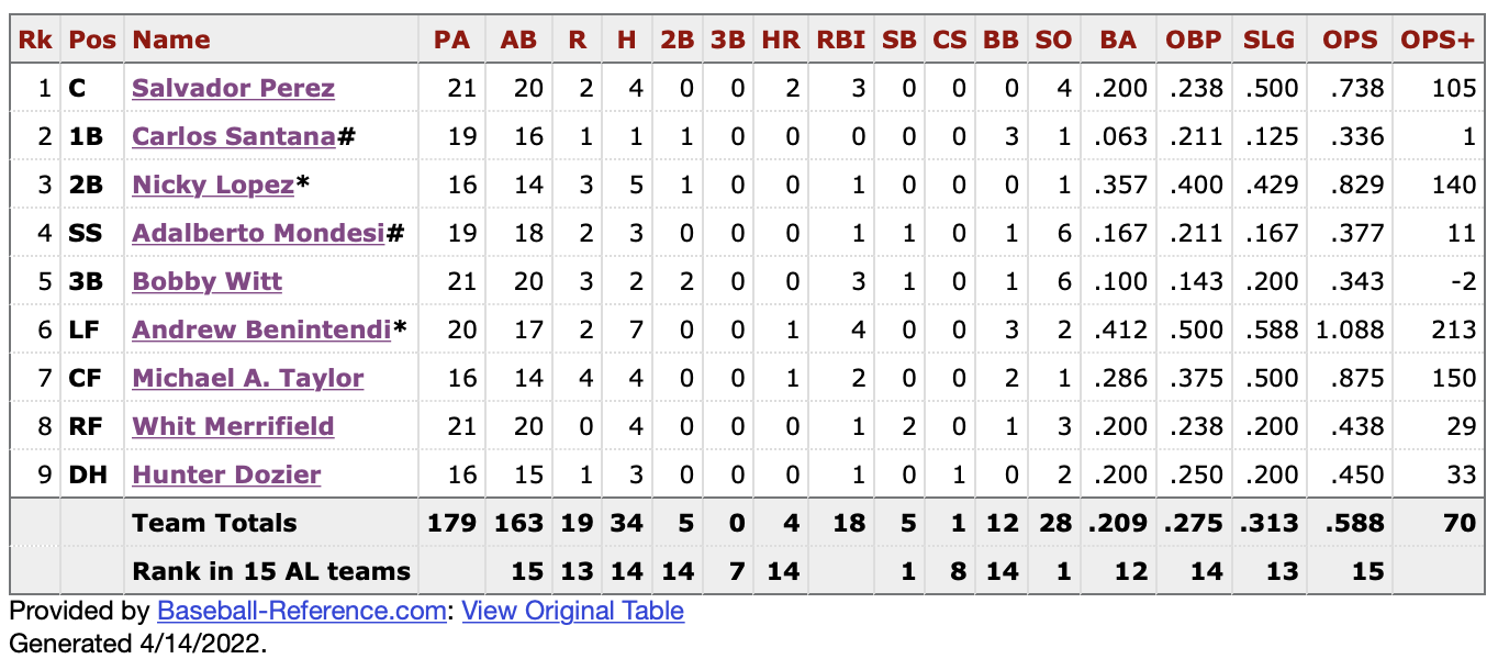The heart of the order featuring Carlos Santana and Hunter Dozier and Adalberto Mondesi has been a black hole, which while it was a worst-case scenario when looking at the start of the 2022 season, also felt like the most likely outcome.