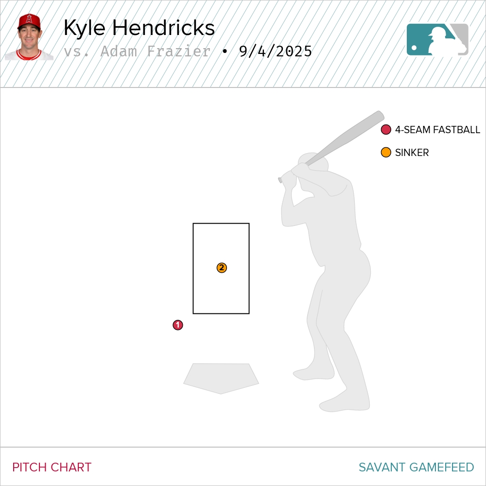 That was the backdrop for their first confrontation in the second inning. Hendricks started Frazier off with a four-seamer low and away for a ball. His second pitch was a mistake. If Kyle Hendricks is going to make a mistake to Adam Frazier, you betcha Frazier is going to cause some pain.