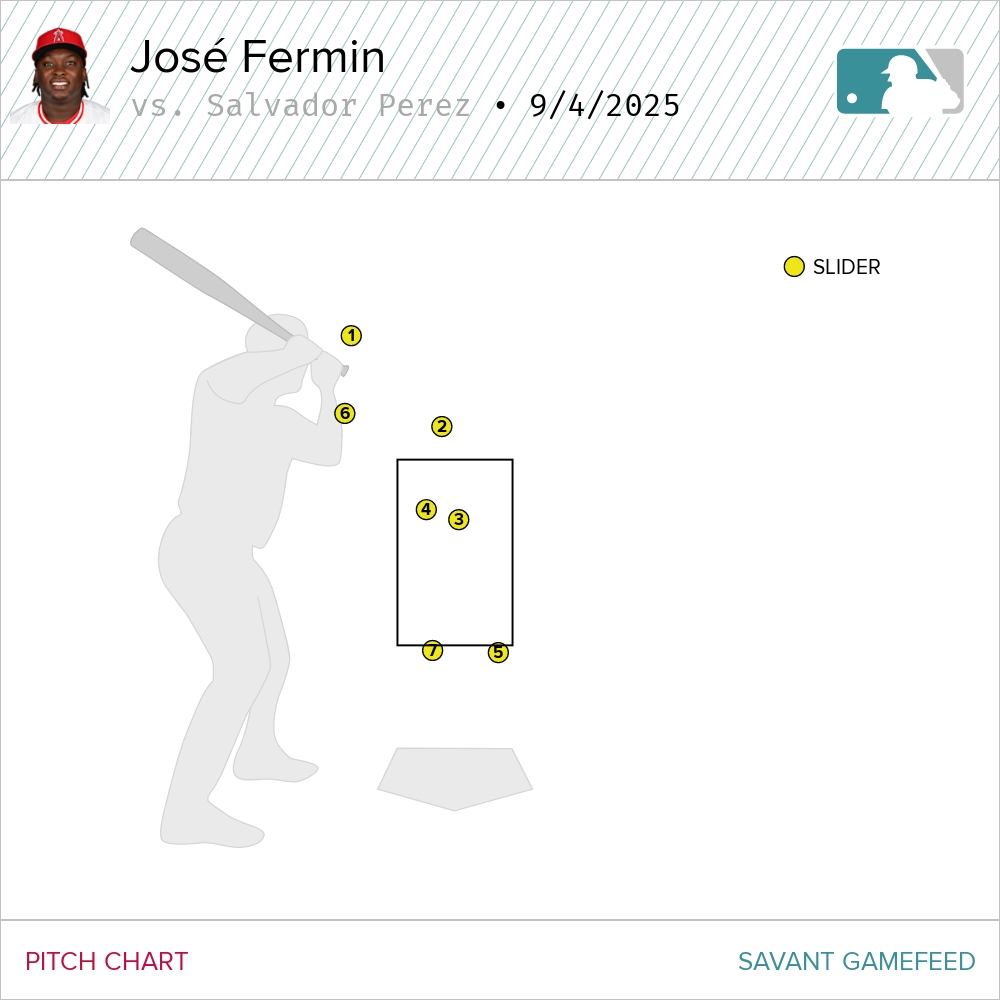 This was Angels reliever José Fermin’s first batter of the night. He’s your typical bullpen guy in 2025: Fastball that runs hot at around 97 mph, complemented by a slider at 90 mph. This is how Fermin approached Perez: