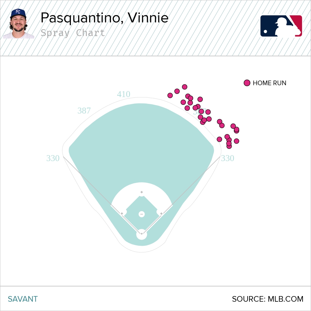 Do you think every Vinnie Pasquantino looks the same? It sure seems that way. Those bombs are either clearing the bullpen or landing among the relievers. If you want to catch a home run ball, I would advise buying a ticket right behind said bullpen.