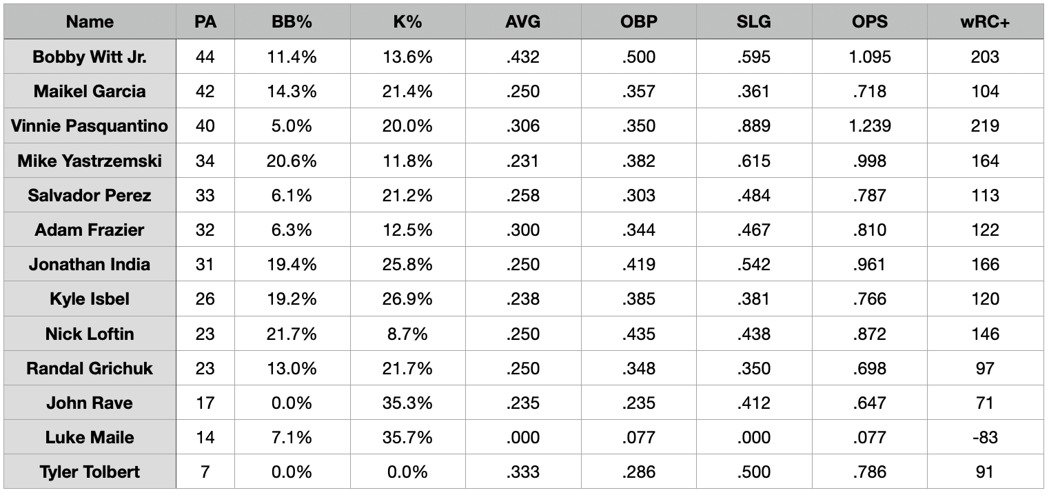 Pasquantino was the leader when it came to power. Bobby Witt Jr. was busy getting on base in this homestand. Hell, here’s how the offense did individually over these last 10 games.