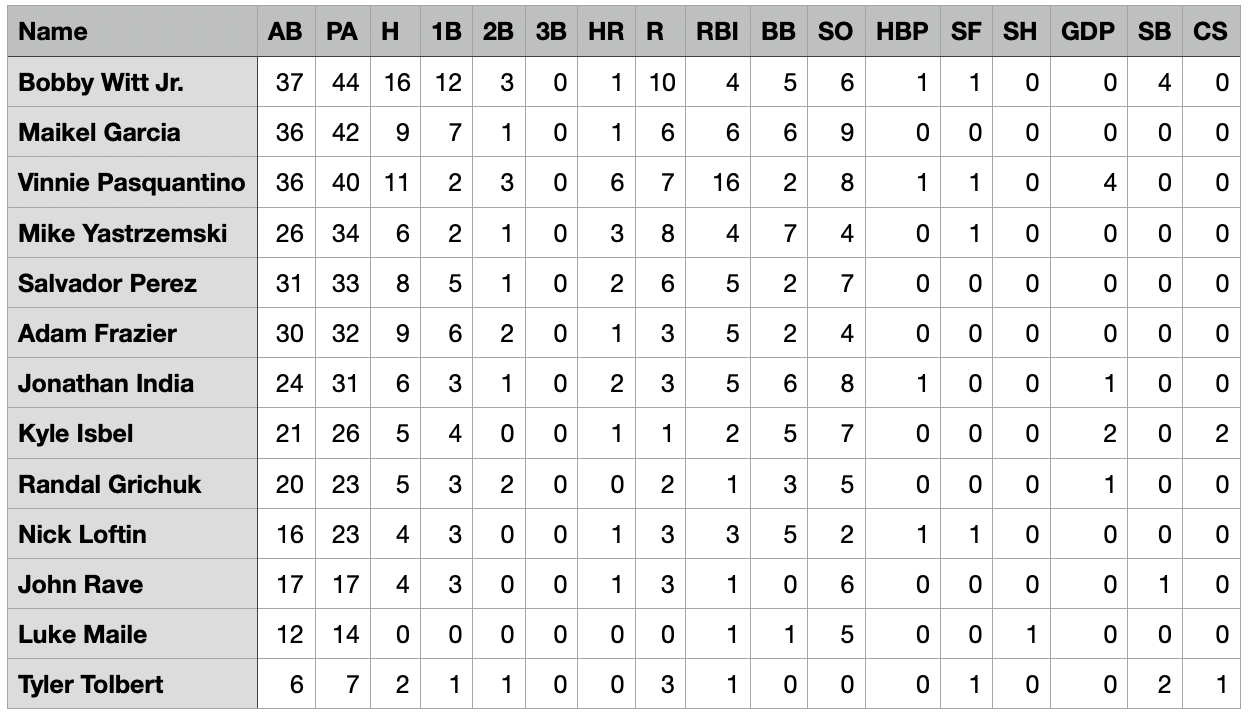 A few things leap off this table. Witt with 16 hits and 10 runs scored. Pasquantino’s six home runs and 16 RBIs. Mike Yastrzemski with six hits, five for extra bases. Nick Loftin with five walks.