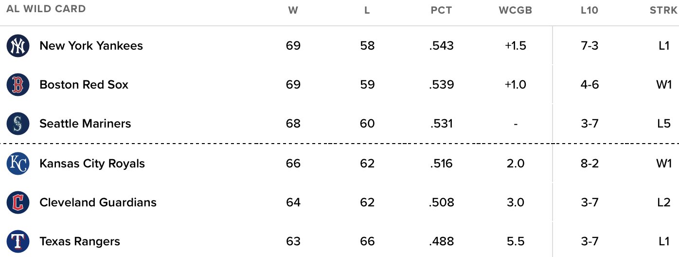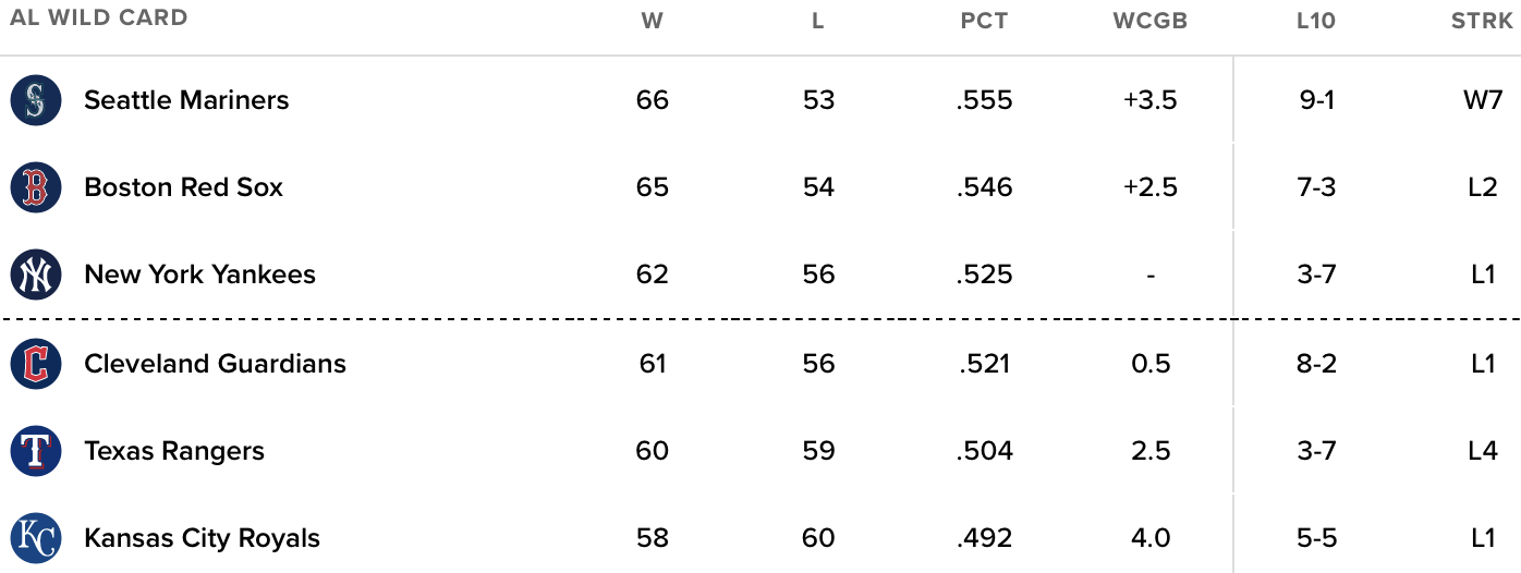 Two teams immediately ahead of the Royals a week and a half ago—the Rangers and the Guardians—both went into the tank, winning just three out of 10. In the Wild Card spots, both the Mariners and Red Sox have dropped their pace. And now the Royals have an opportunity.