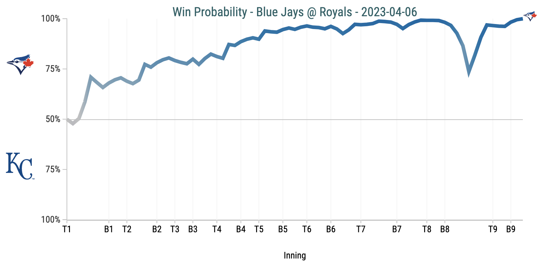 Four Royals had come to bat. They had yet to make an out and had cut their deficit to 6-2. Their Win Probability was at 13.4 percent.