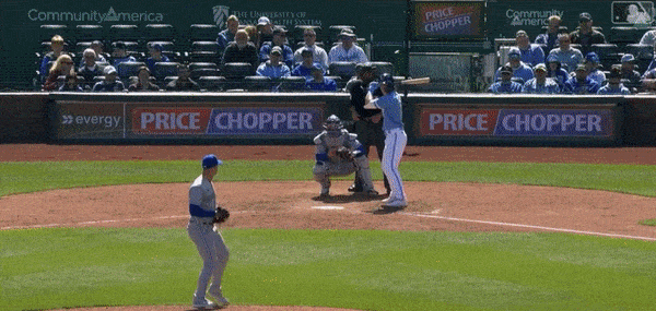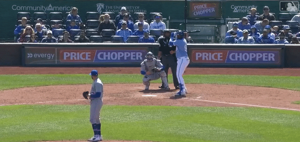 Up next is Salvador Perez. We know how this dude loves to expand the strike zone. Hell, it’s not so much a strike zone as it’s a zip code. Yet, he still finds a way to make things happen. In this plate appearance, he rides with a Richards fastball off the plate to flare a single to right. It was 69 MPH off the bat. Melendez advances to third.