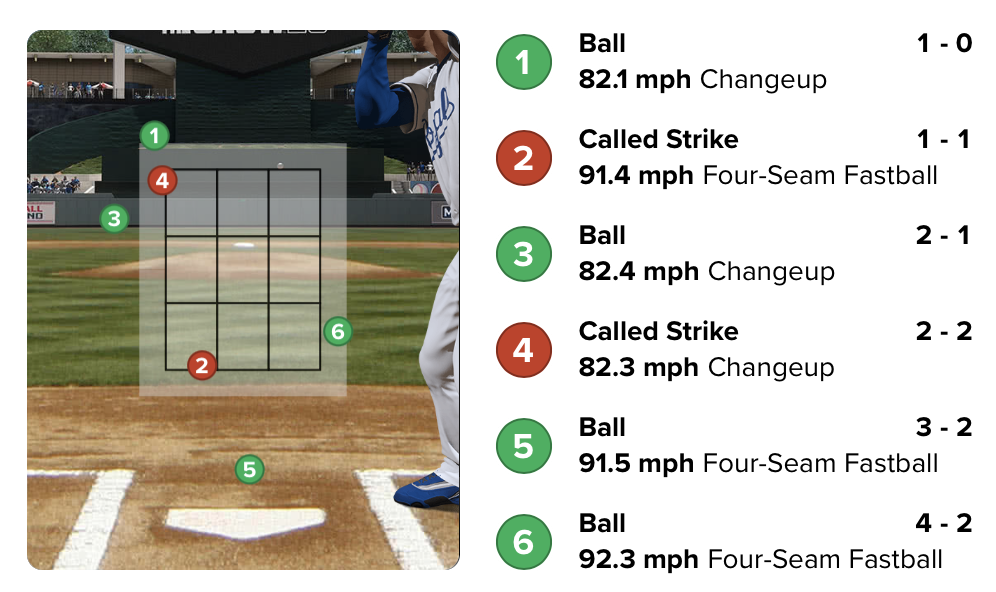 He chased the first pitch out of the zone and made contact to foul it off. He fouled off another before watching the third pitch for a ball. The fourth pitch was the exact same pitch in the exact same location as the pitch he took for a ball.