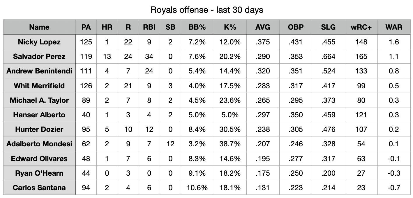 Nicky Lopez - Professional hitter. He’s powering those numbers with a .427 BABIP, which is most definitely unsustainable, but goodness is he some kind of locked in at the plate.