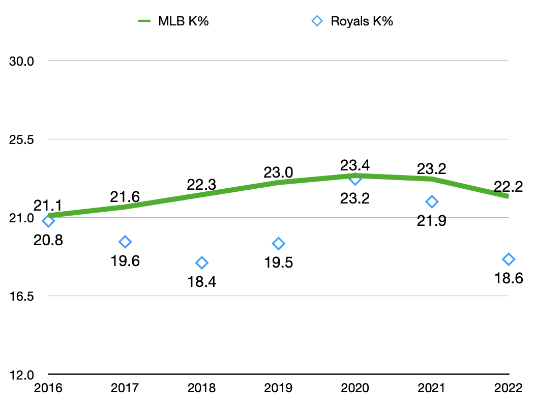 It’s important to note that my jumping-off point of 2016 isn’t arbitrary or just the first season after the world championship, rather it’s the first time where the strikeout rate jumped above 21 percent. Here’s how the Royals have done against league average since then.