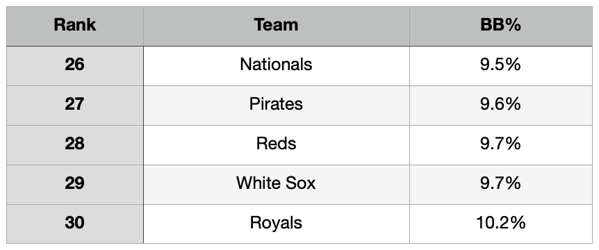 You could maybe live with a lower strikeout rate if the starters could actually find the strike zone. That Royals’ walk rate is also one of the 10 worst we’ve seen since 2016. If you throw out the Covid shortened 2020 season, their current walk rate is tied for third-worst since ‘16. As you would expect by the superlatives of this paragraph, the Royals’ walk rate is the highest in the majors.
